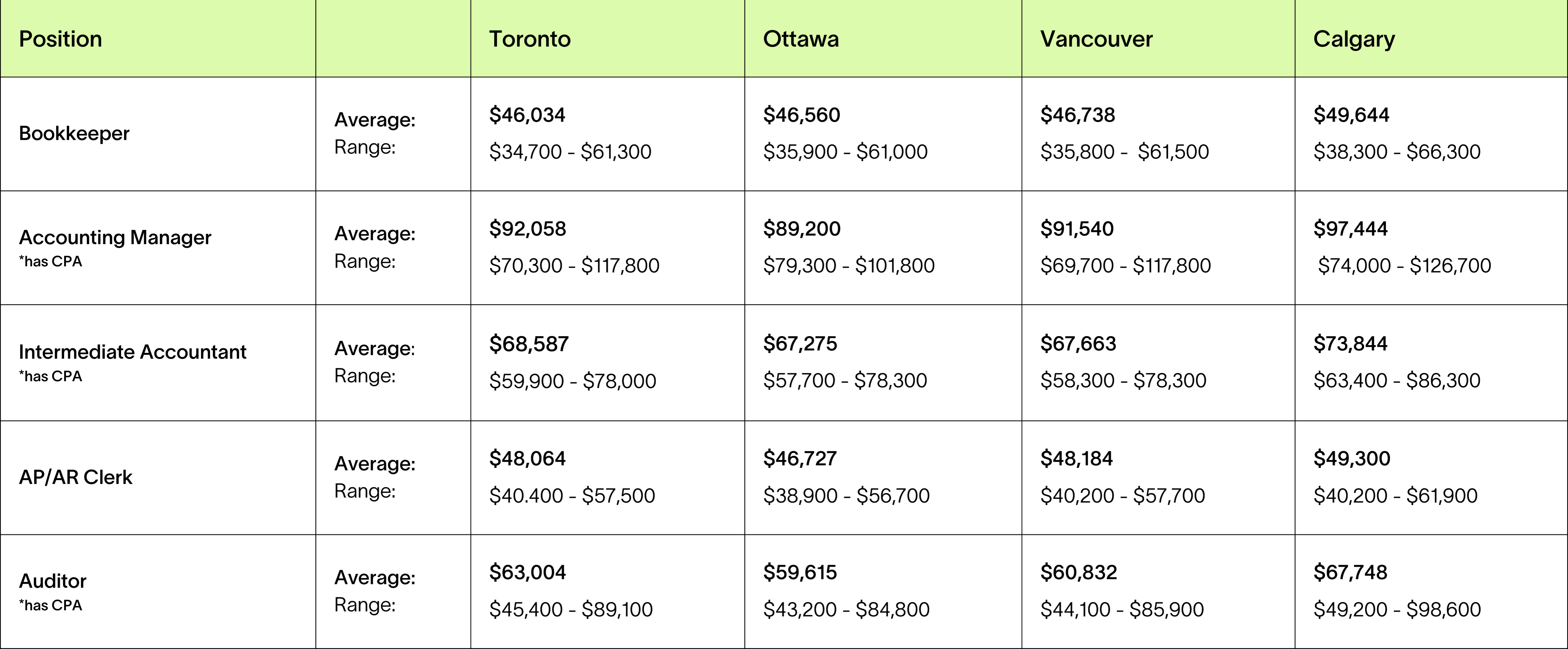 Curious what a career in accounting can look like from a compensation standpoint? Below, we’ve highlighted salary data for three of the most in-demand roles — from early career to management — so you can see how earnings stack up across major cities in Canada.