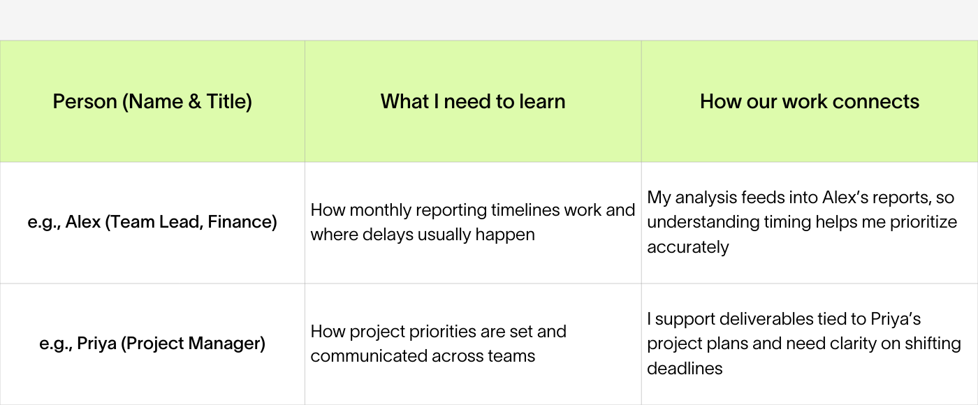 You don’t need to fill this out all at once. Add to it gradually as you learn more about the team and the broader organization.